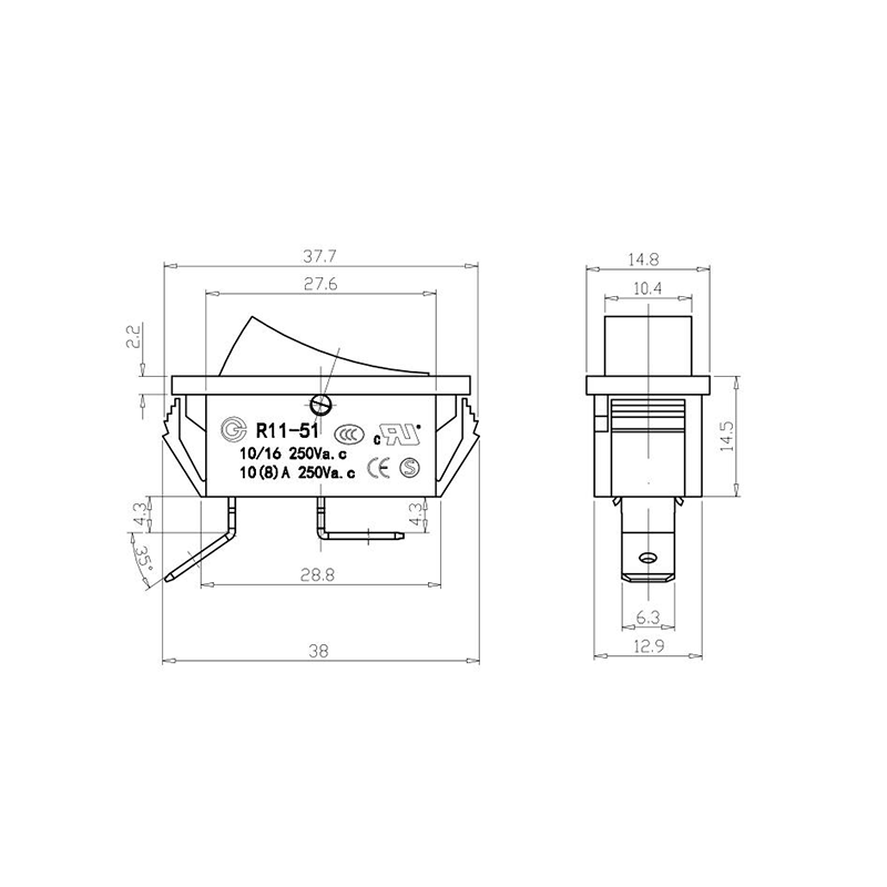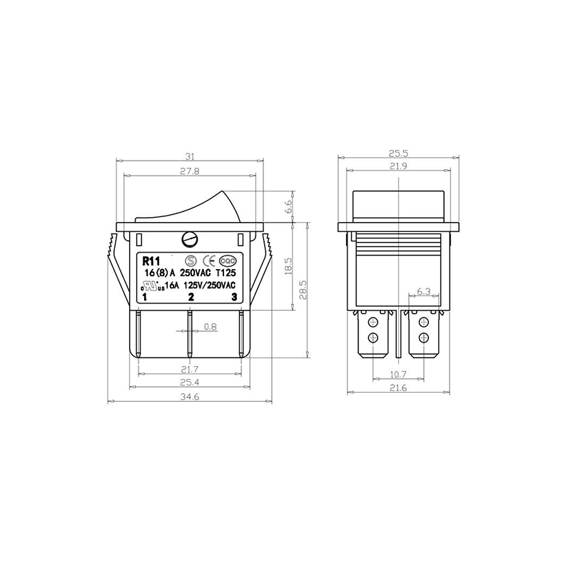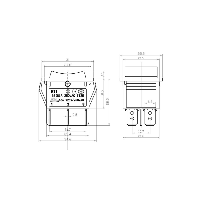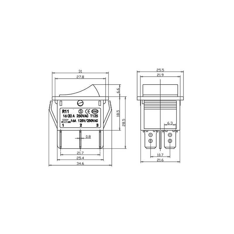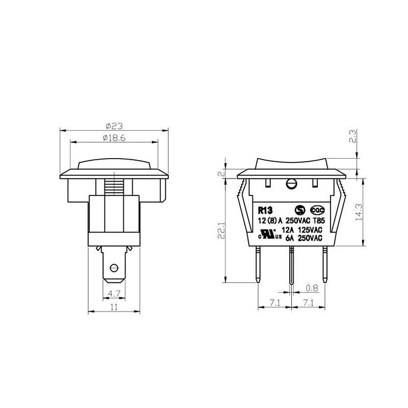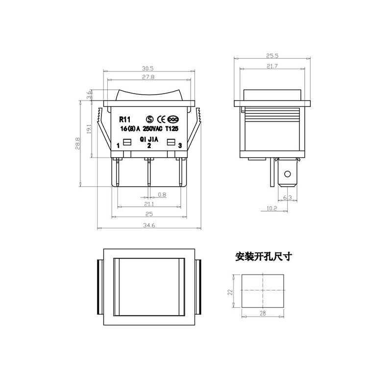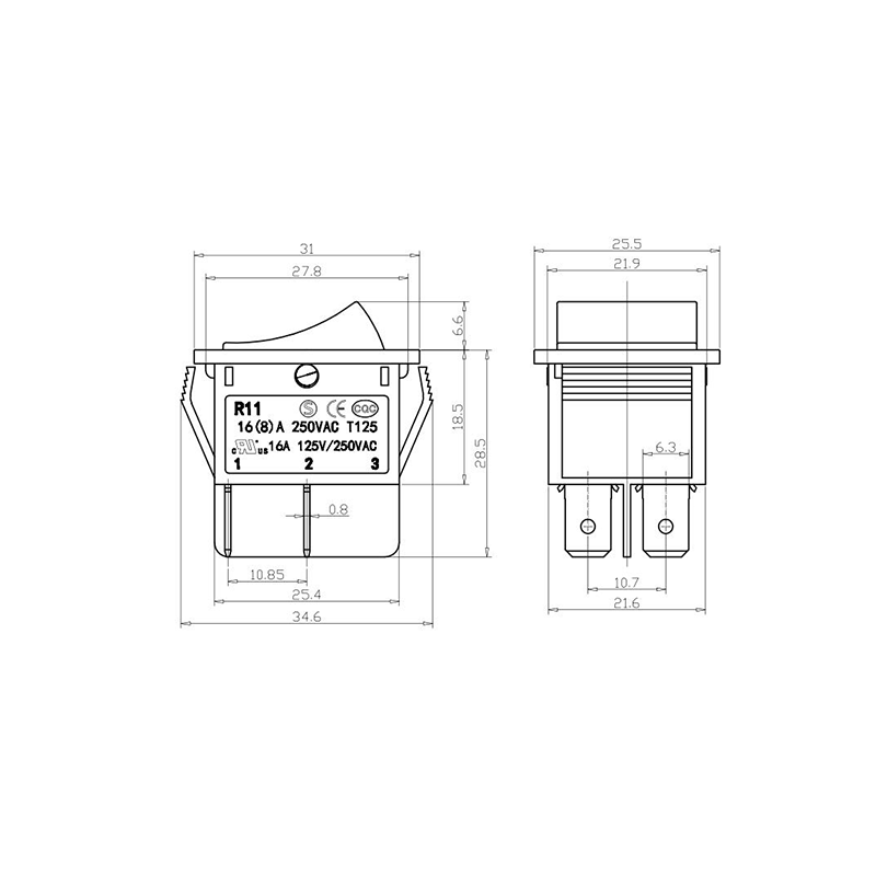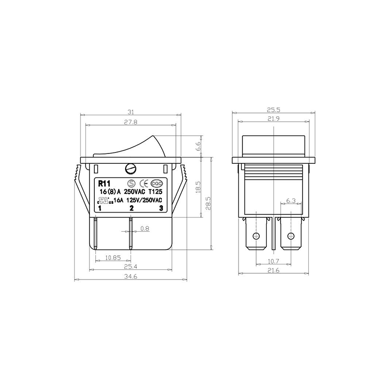 R11-82 전동 공구 로커 스위치 시리즈는 광범위한 전력 장비 애플리케이션용으로 설계된 고성능 표준 로커 스위치입니다. 명확하게 표시된 "| / O" 기호가 있는 곡선 직사각형 액추에이터를 특징으로 하여 직관적인 사용자 상호 작용을 보장합니다. 생생한 노란색, 빨간색, 클래식 검정색으로 제공되는 이 스위치는 다양한 장치 색상 구성에 적합할 뿐만 아니라 가시성과 작동 안전성도 향상시킵니다.